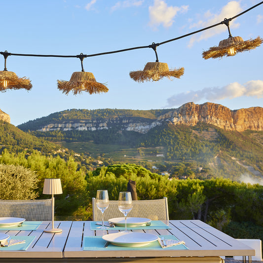 Guirlande lumineuse raccordable d'extérieur avec abat-jour en herbe marine style bohème 7 ampoules à filament douille E27 LED blanc chaud TESSA LIGHT 6m