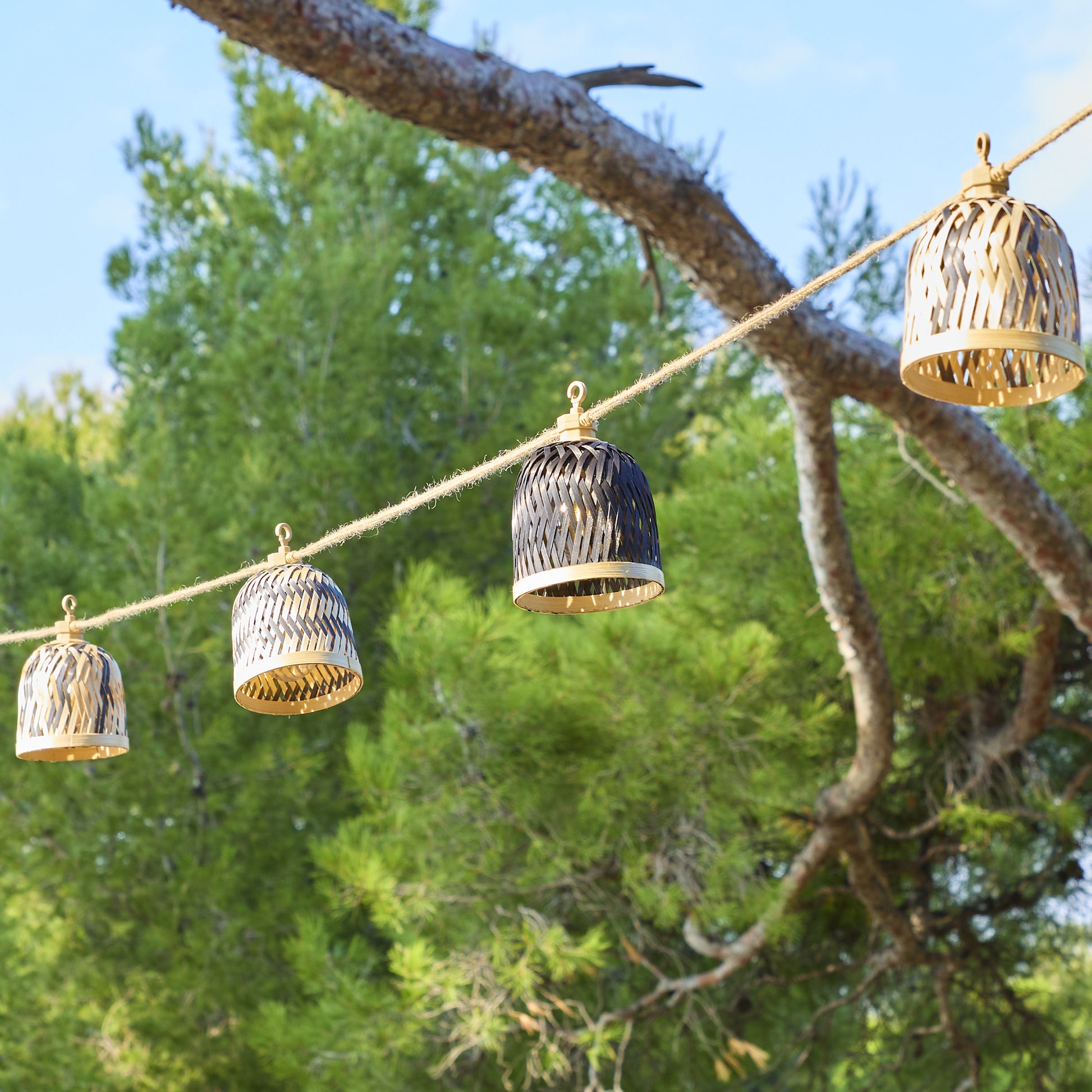 Guirlande lumineuse extérieur raccordable 10 abat-jour naturels en bambou LINA LIGHT HYBRID LED blanc chaud 8m solaire et sur secteur