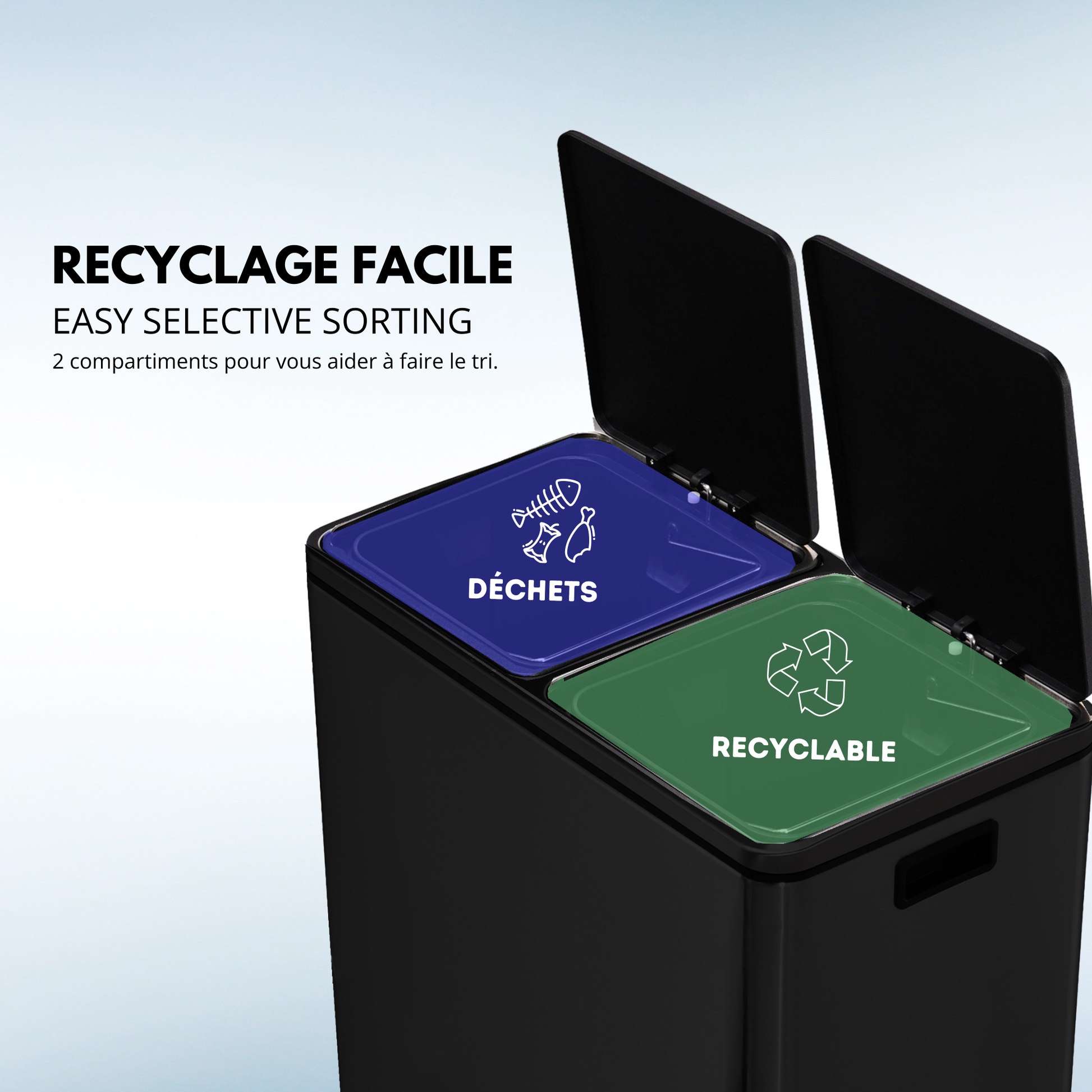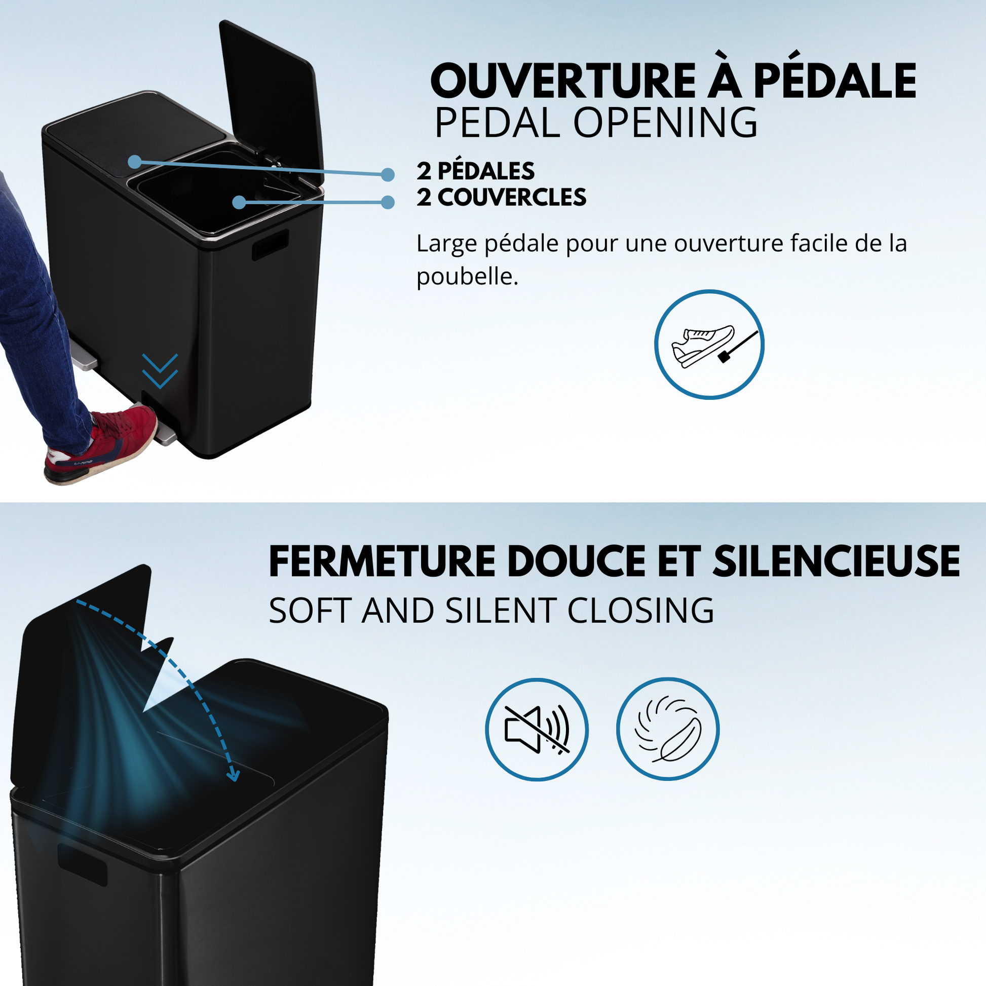 - Rechteckiger Sortier-Tretmülleimer mit Eimer Fassungsvermögen 60 l (2 Fächer à 30 l) MAJOR-Modell in Edelstahlfarbe mattschwarz Abmessungen: 60 x 36 x H65 cm Gewicht: 11,6 kg. Edelstahlgehäuse (0,4 mm) und schwarzer PP-Deckel.