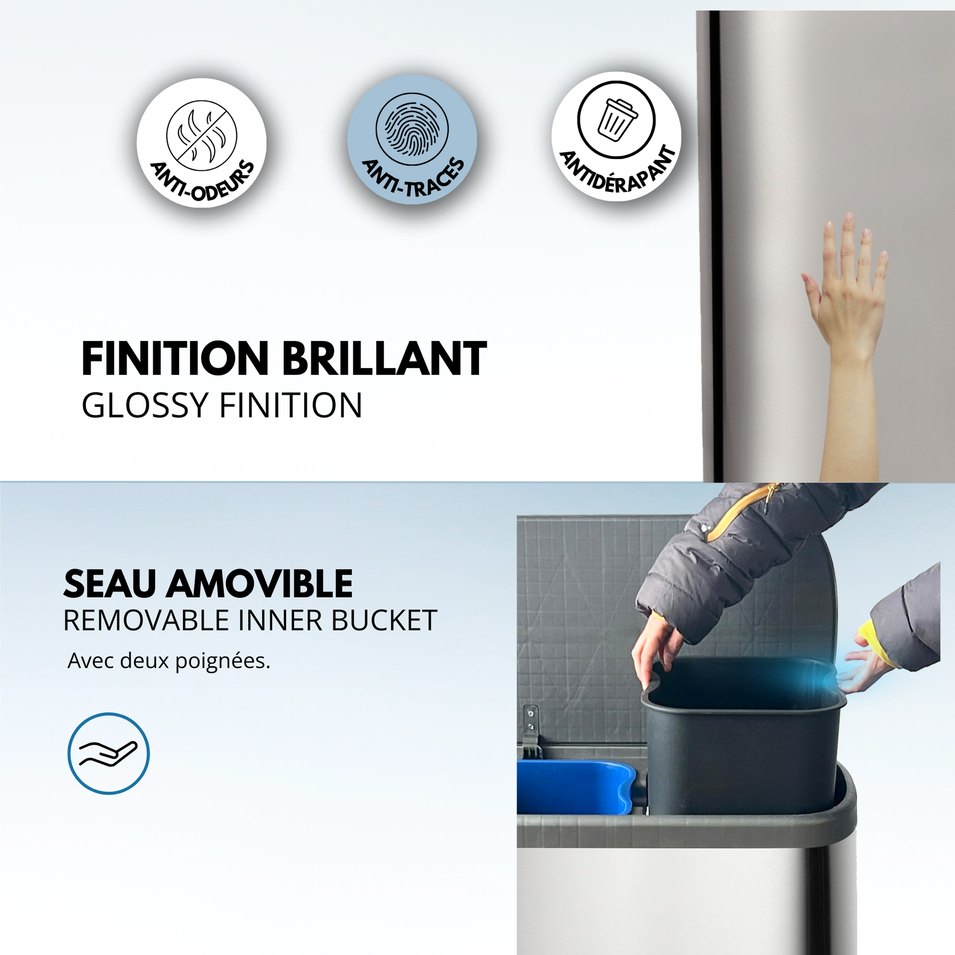- Plus qu'une poubelle, un meuble design. Il n'est pas utile de se baisser pour jeter ses déchets. Poubelle Stable. Base antidérapante. Fermeture silencieuse et Anti-Traces de Doigts. Cette poubelle a tout pour plaire. Nul besoin de la cacher dans un coin : faites-en un élément à part entière de votre déco. Idéal pour la cuisine, la salle de bain, le bureau, la chambre, la buanderie et tout autre endroit de passage où vous avez besoin d’une poubelle. Look moderne et élégant.
