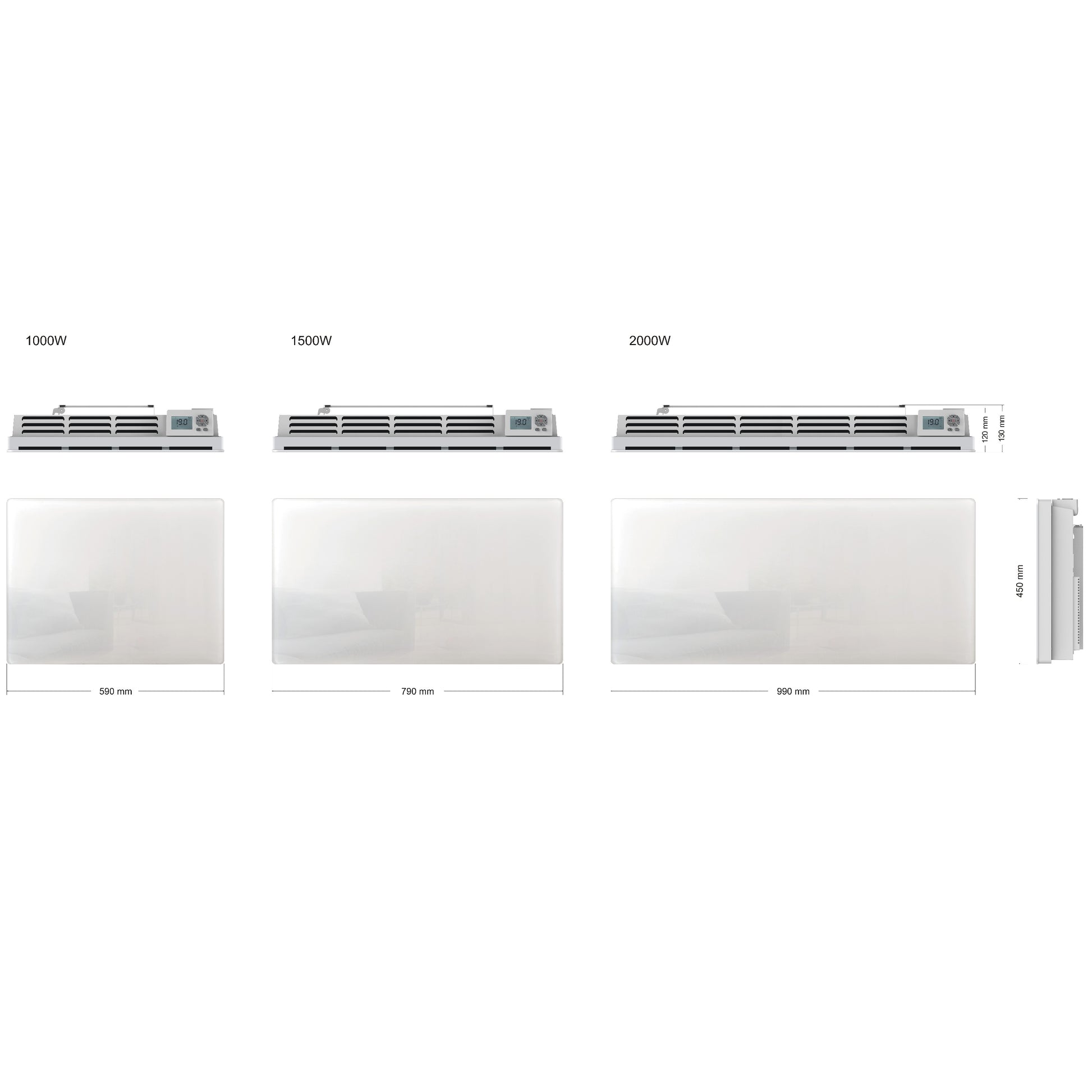 Keramik- Trockendurchlauferhitzer mit Glasfront. Elektronische Steuerung mit LCD-Digitalbildschirm, 4 Modi (Komfort, Normal, Eco und Frostschutz), 3 vorinstallierte Programme , Tages- und Tagesprogrammierung, Erkennung offener Fenster, Überhitzungsschutz, Pilotdraht 6-Ordnung, gebogenes Bedienfeld, neues ERP ( 2015) /1188) Richtlinie, Klasse II, IP20. CE/NF/RoHS/ERP-Standard. 2 Jahre Garantie