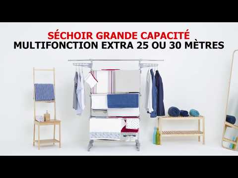 - Seine vielen Konfigurationsmöglichkeiten sowie sein cleveres Zubehör: Kleiderbügelhalter, Verlängerungsstange, einziehbare Stangen, lenkbare Räder, machen ihn zu einem der vielseitigsten Trockner auf dem heutigen Markt.