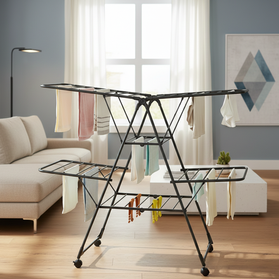 Optimisez l’entretien de votre linge avec le séchoir à linge pliable ALBA, un étendoir intérieur grande capacité alliant design contemporain, robustesse et performance XXL. Conçu pour les familles, les maisons modernes et les appartements, ce séchoir type A-Frame offre une surface de séchage exceptionnelle de 26 mètres, idéale pour 2 à 3 machines de linge. Sa structure intelligente multi-niveaux permet de sécher simultanément draps, vêtements, linge de maison, jeans, serviettes, petits accessoires et textiles volumineux, tout en conservant un encombrement au sol optimisé avec une longueur de 157 cm. Robuste et élégant, le séchoir ALBA est fabriqué en acier haute qualité avec une finition noire mate “black powder coating”, garantissant une résistance à l’humidité, une durabilité accrue et un style industriel premium parfaitement adapté à une buanderie, un salon, une salle de bain ou une pièce à vivre moderne. Sa structure renforcée peut supporter jusqu’à 30 kg de linge humide, assurant une stabilité optimale même en charge maximale. Pratique au quotidien, malgré sa grande capacité d’étendage, le séchoir à linge ALBA reste léger et maniable avec un poids net de 5,1 kg. Ses pieds équipés de roulettes facilitent le déplacement d’une pièce à l’autre, selon vos besoins ou l’ensoleillement intérieur. Pliable et compact une fois replié, il se range facilement dans un placard, un cellier ou derrière une porte. Séchoir à linge pliable ALBA, étendoir intérieur grande capacité, 26 m d’étendage, structure acier, noir mat, design industriel, gain de place, robuste, mobile, supporte charges lourdes, usage familial.