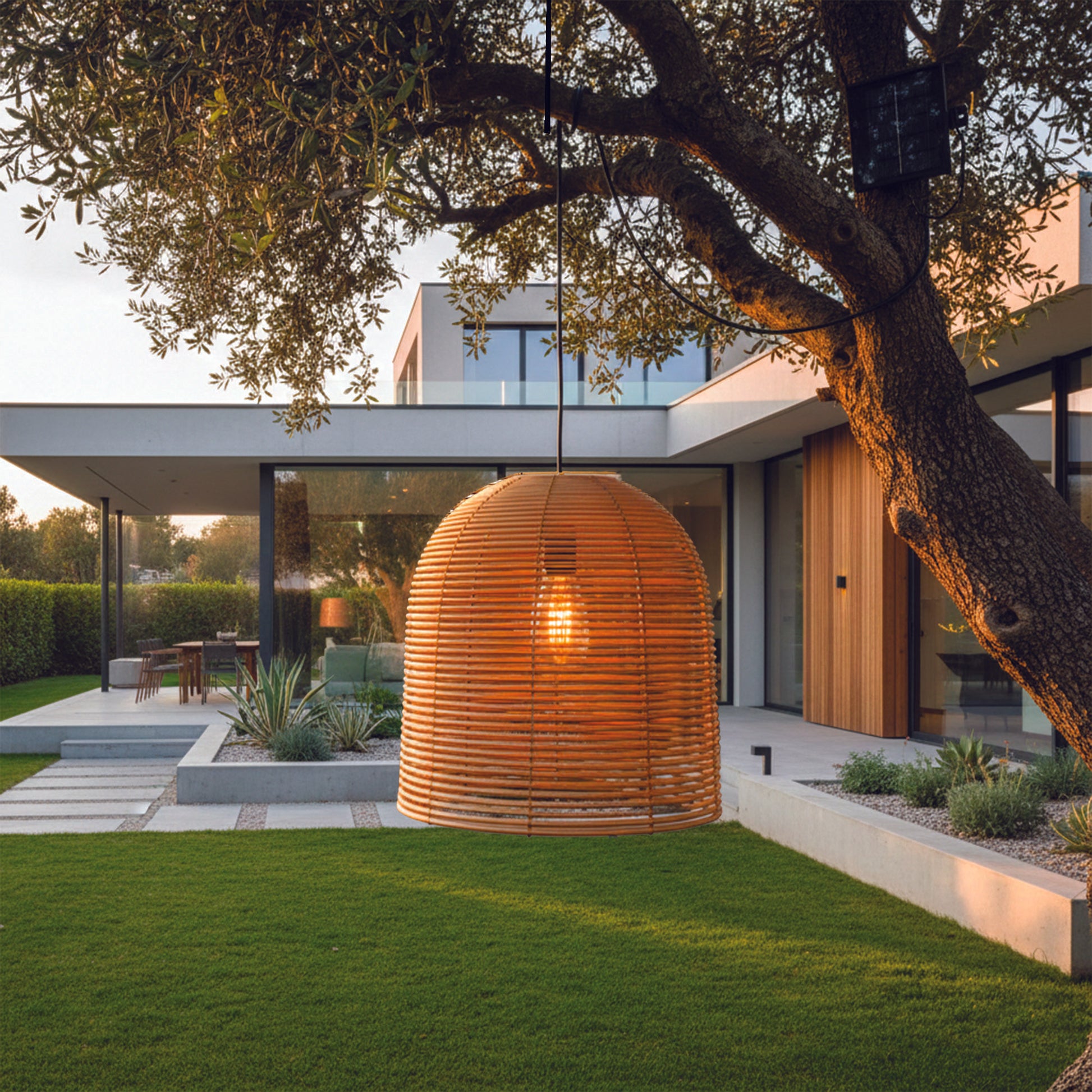 Découvrez la Suspension HANG BOHEME OUTDOOR CABLE, une pièce tendance qui apportera un look ethnique chic et chaleureux à votre extérieur. Fabriquée en poly rotin, cette suspension est une pièce décorative idéale pour un style bohème ou vintage. (⌀30 x H31 cm). Installation Filaire Extérieure (IP64) : La suspension est équipée d'un câble pour l'extérieur de 5 mètres avec un raccordement sur secteur (220-240V). C'est le câble et la douille qui sont certifiés IP64, assurant leur protection contre les projections d'eau (nécessaire pour une installation extérieure sécurisée). Suspendez-la sur une branche d'arbre, sous un parasol ou une pergola pour créer une ambiance lumineuse chaleureuse. Ampoule Personnalisable (E27) : Le câble est fourni sans ampoule, vous laissant libre de choisir celle qui vous plaît (culot E27, puissance maximum de 25W).