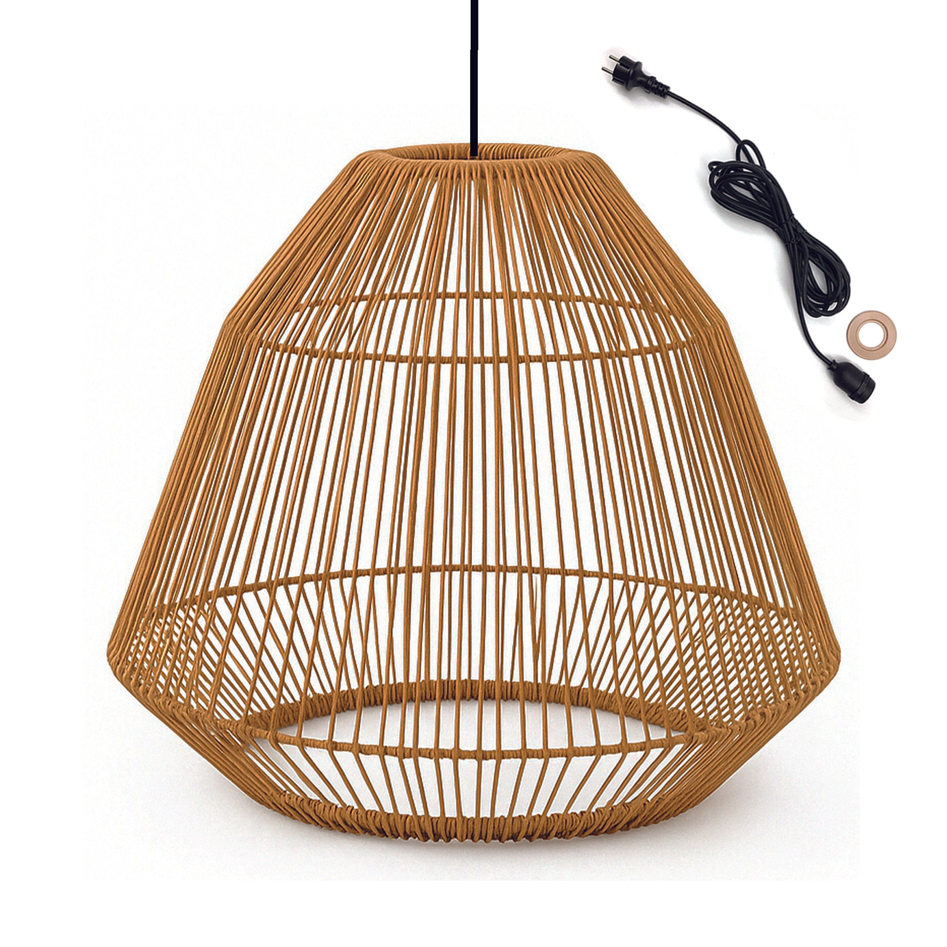 Découvrez la Suspension MAYA OUTDOOR CABLE, une pièce tendance qui apportera un look ethnique chic et chaleureux à votre extérieur. Fabriquée en poly rotin, cette suspension est une pièce décorative idéale pour un style bohème ou vintage. (⌀41 x H39 cm). Installation Filaire Extérieure (IP64) : La suspension est équipée d'un câble pour l'extérieur de 5 mètres avec un raccordement sur secteur (220-240V). C'est le câble et la douille qui sont certifiés IP64, assurant leur protection contre les projections d'eau (nécessaire pour une installation extérieure sécurisée). Suspendez-la sur une branche d'arbre, sous un parasol ou une pergola pour créer une ambiance lumineuse chaleureuse. Ampoule Personnalisable (E27) : Le câble est fourni sans ampoule, vous laissant libre de choisir celle qui vous plaît (culot E27, puissance maximum de 25W).